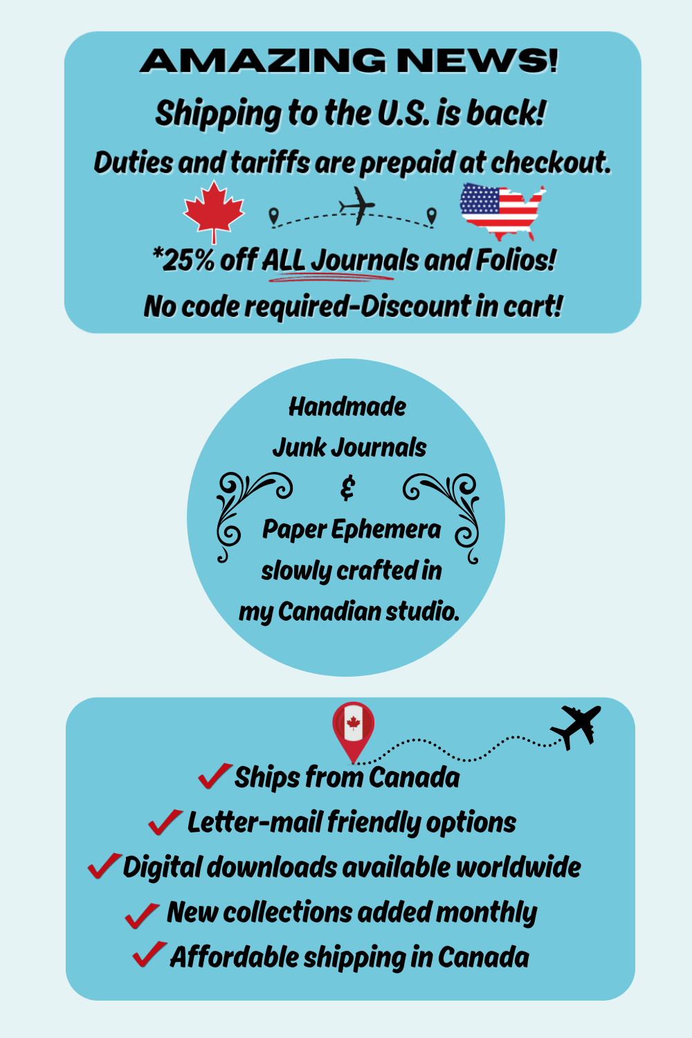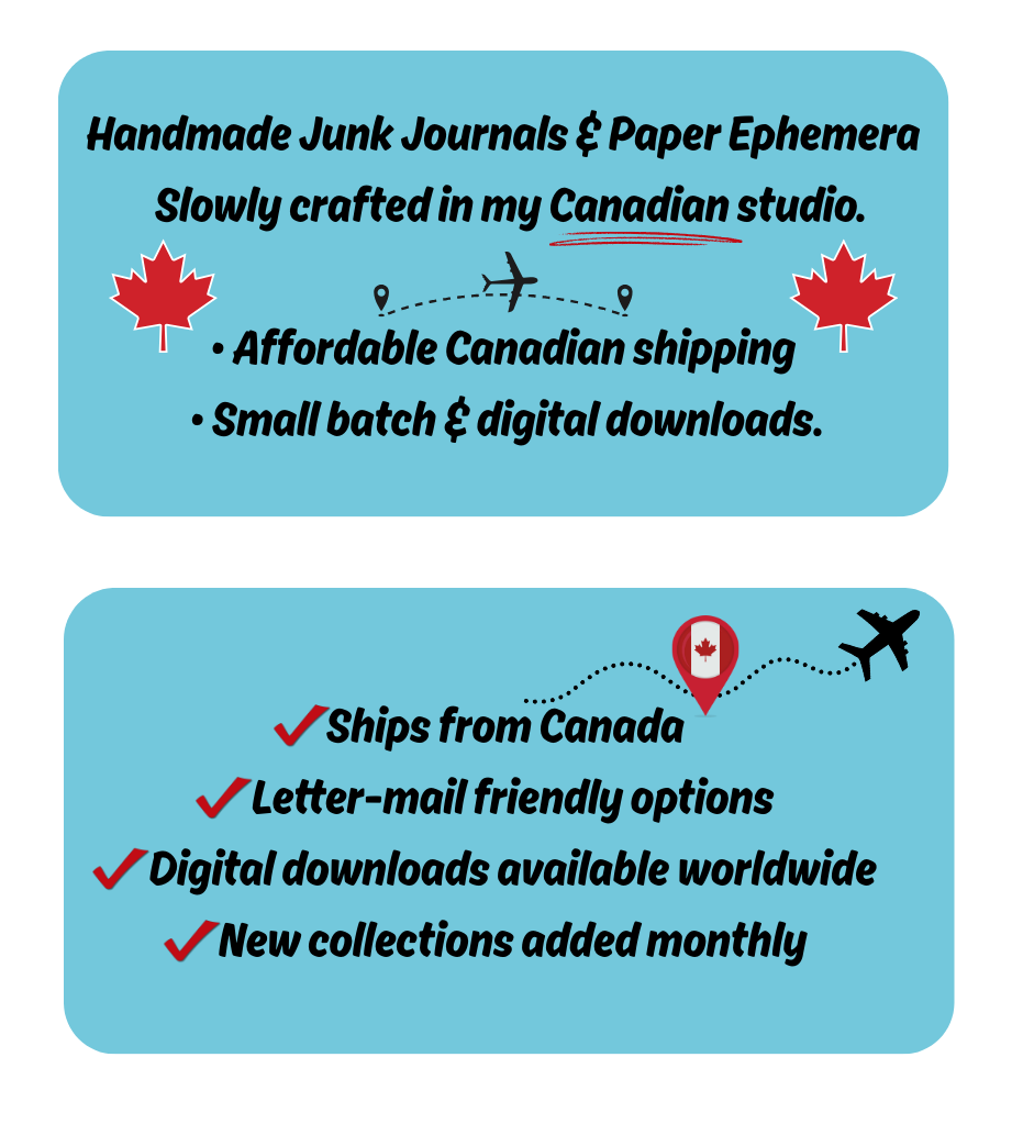 Hiya! Every journal, tag, postcard, and ephemera pack is crafted by hand in my Ontario studio.