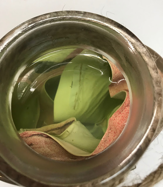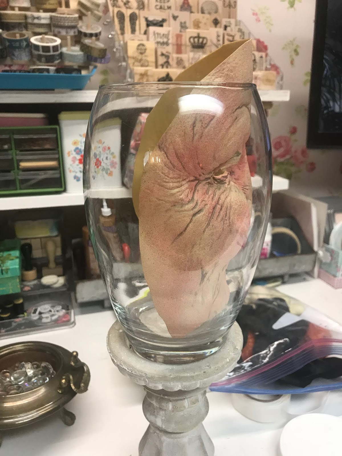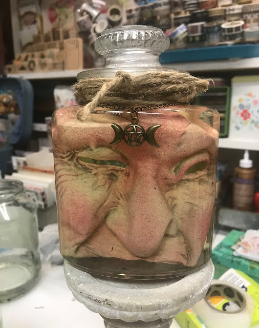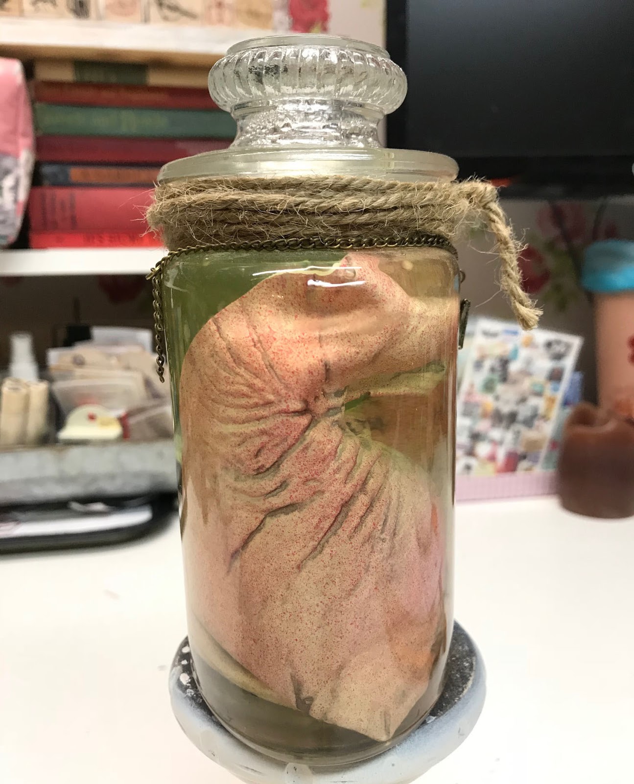I gave it a try with this jar trying a lid and I put it on the mantle but this jar was too big, too tall and the mask didn't "squish" the face very well.