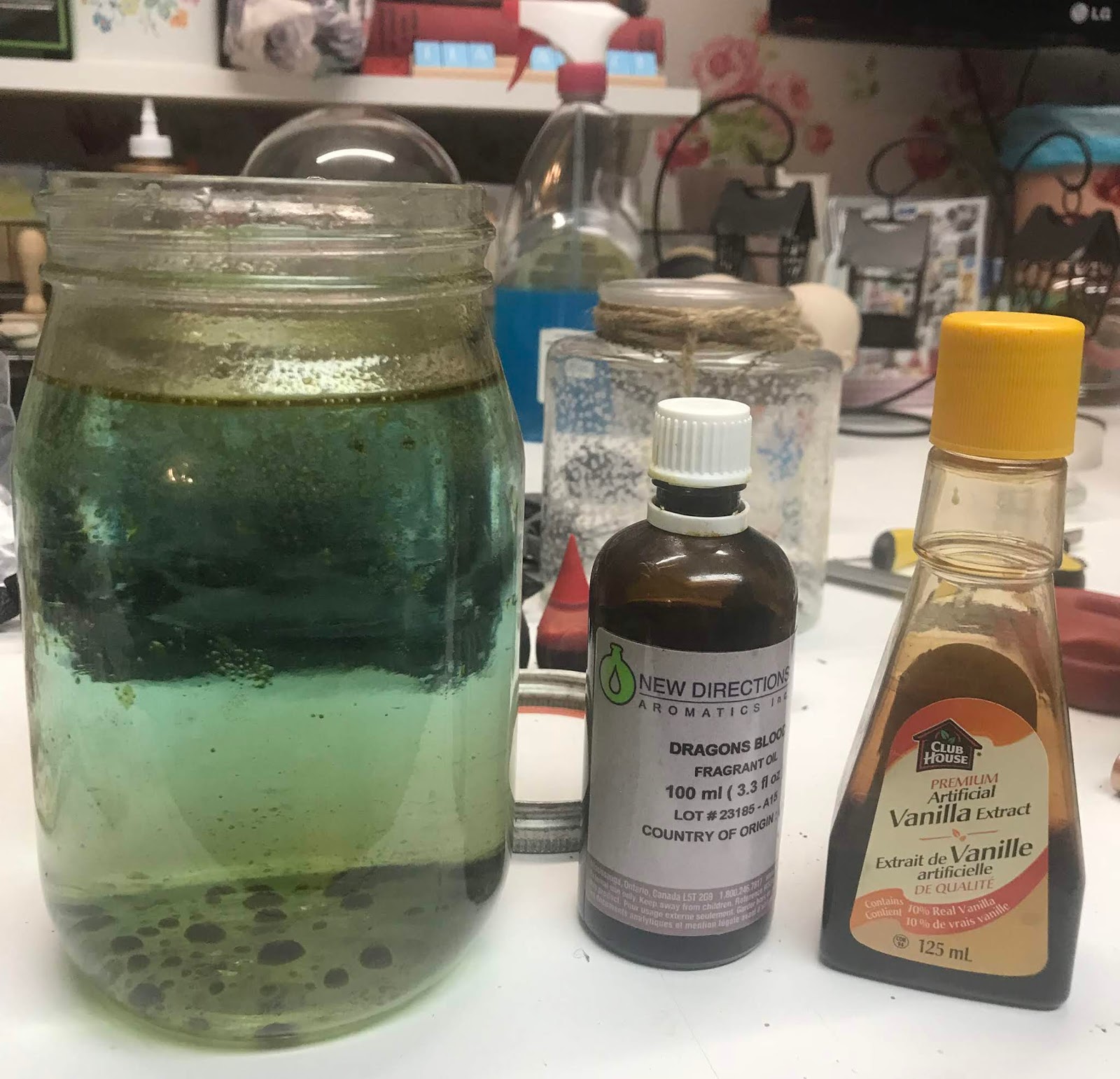 to over do it until I saw how it would mix. The fragrant oil hung in little black balls which was fun. I wasn't sure how long they would last but the fragrant oil added a nice mix to the consistency to the water. The vanilla helped the water to look murky in a way the food colouring couldn't.
