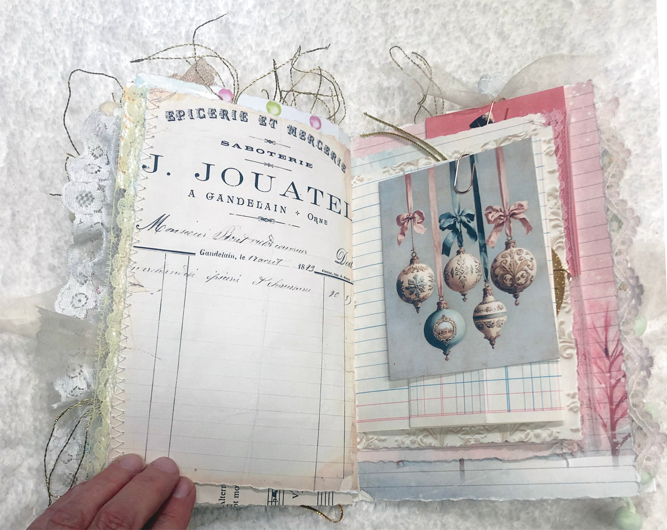 This cute handmade Christmas junk journal featuring beautiful mid century inspired art, vintage lace, and layered mixed-media pages is perfect for journaling, memory keeping, and creative holiday crafting. One of a kind.